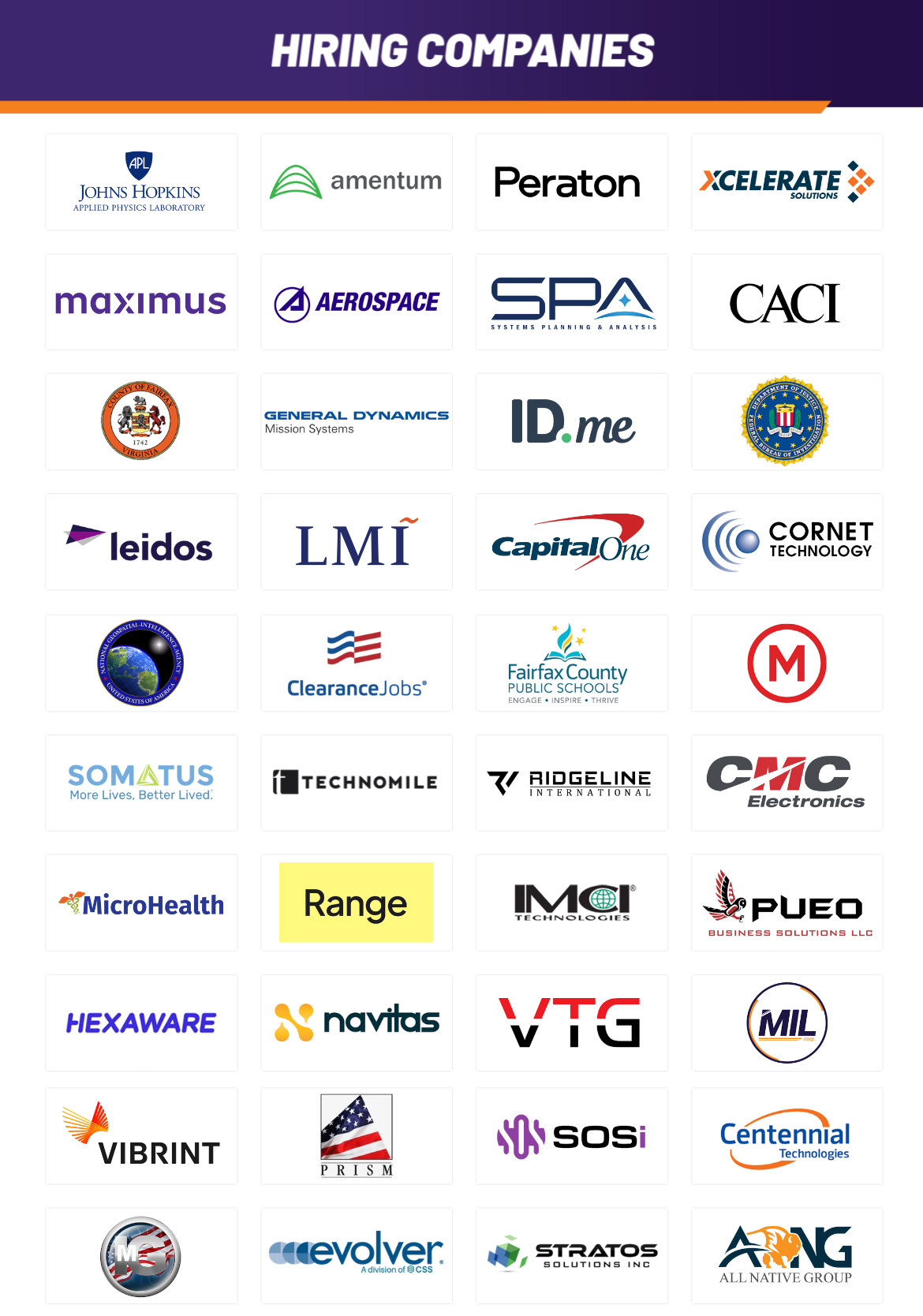 Step into the heart of Northern Virginia's world-class tech and cyber ecosystem—where innovation shapes national security, fuels space exploration, powers next-gen healthcare, and drives breakthroughs that impact millions. Whether you're an experienced professional looking to advance your career or a cleared candidate ready for your next mission-driven opportunity, this hiring event is a gateway to advancing your future in one of the nation's most dynamic innovation hubs.